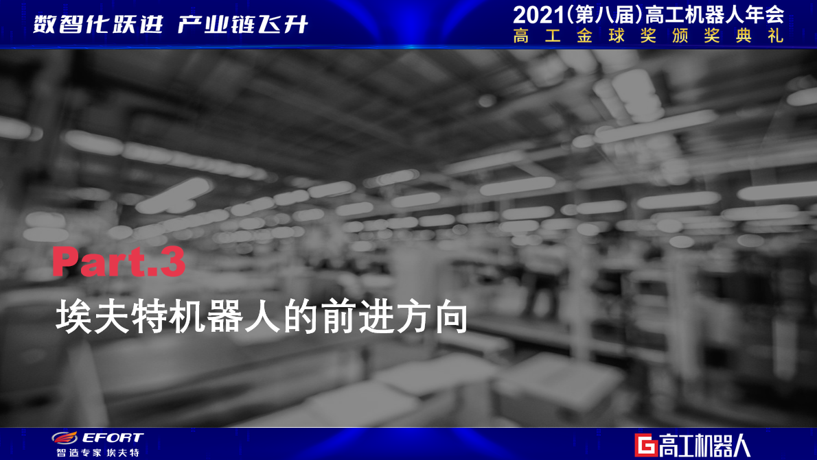 同期,本屆年會特設了以“高瞻遠矚 躍進飛升”為主題的閉幕式專場,作為國產(chǎn)機器人第一梯隊企業(yè) ,埃夫特2021年迎來了高質(zhì)量發(fā)展期的開局之年,埃夫特副總經(jīng)理王富康應邀發(fā)表了“國產(chǎn)機器人崛起之路”的主題演講。