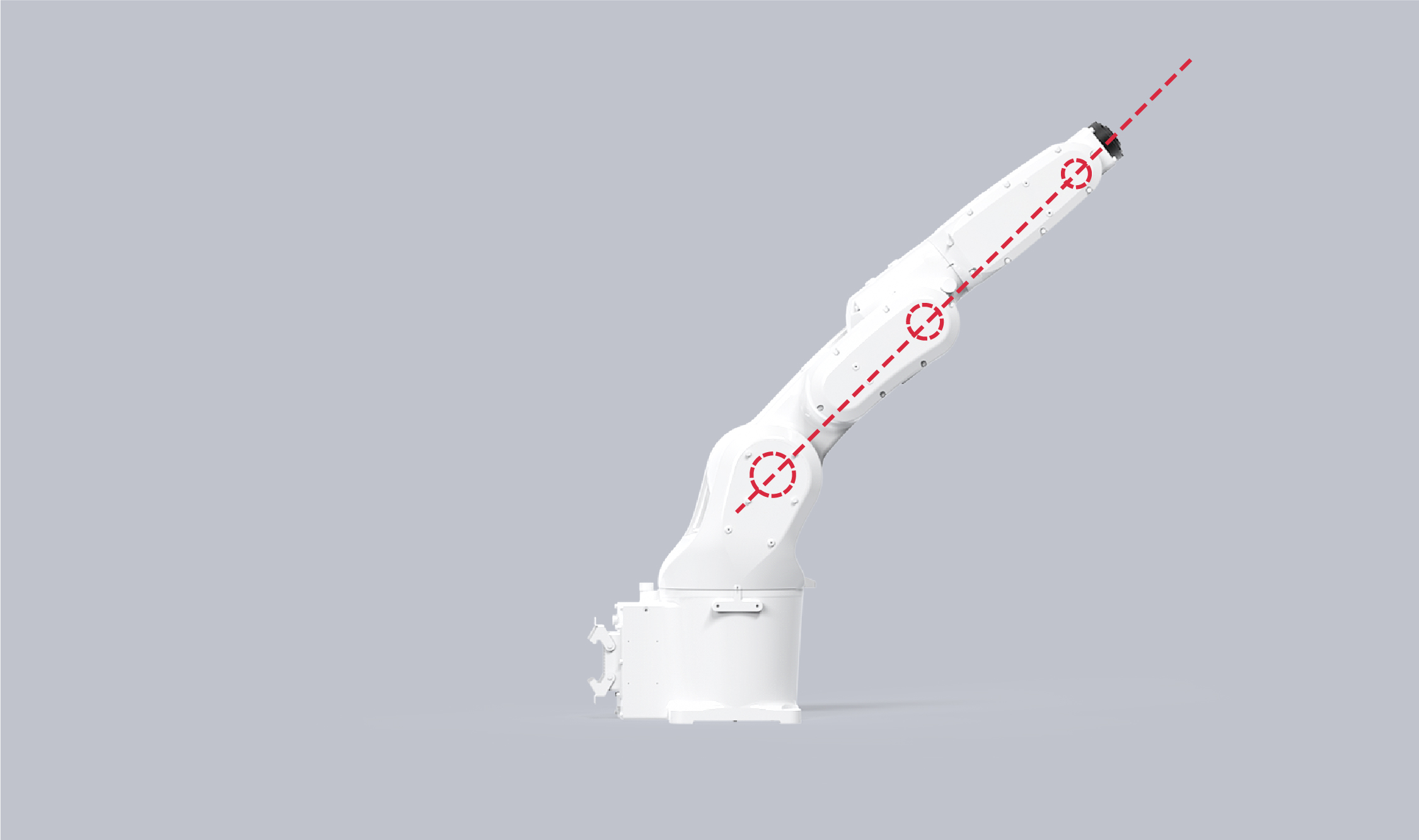 肘關(guān)節(jié)奇異點(diǎn)一般位于機(jī)器人工作區(qū)域的最外緣,看起來像機(jī)器人“伸得太遠(yuǎn)”,導(dǎo)致肘部鎖定在某個(gè)空間位置無法運(yùn)動(dòng)。