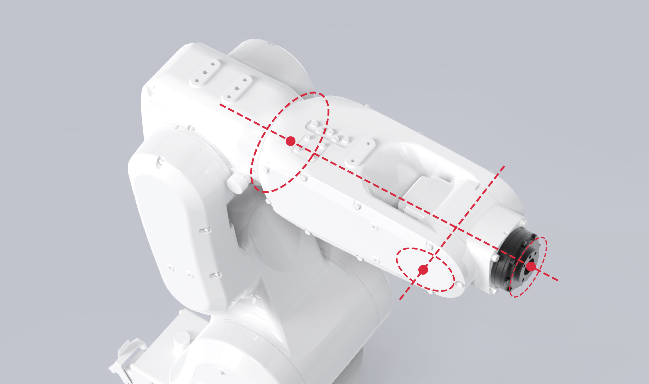 因此,要熟練的應(yīng)用工業(yè)機(jī)器人,對(duì)工業(yè)機(jī)器人奇異點(diǎn)進(jìn)行一定程度地了解是非常有必要的。常見的六軸串聯(lián)工業(yè)機(jī)器人會(huì)在三個(gè)位置逆解出無數(shù)個(gè)解的情況,出現(xiàn)三種奇異點(diǎn),分別為肩關(guān)節(jié)奇點(diǎn)、肘關(guān)節(jié)奇點(diǎn)和腕關(guān)節(jié)奇點(diǎn)。